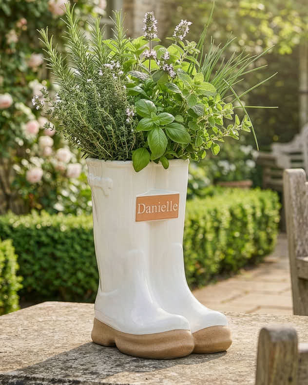 Showcase your favourite plants and flowers with this personalised large white ceramic wellington boots planter.