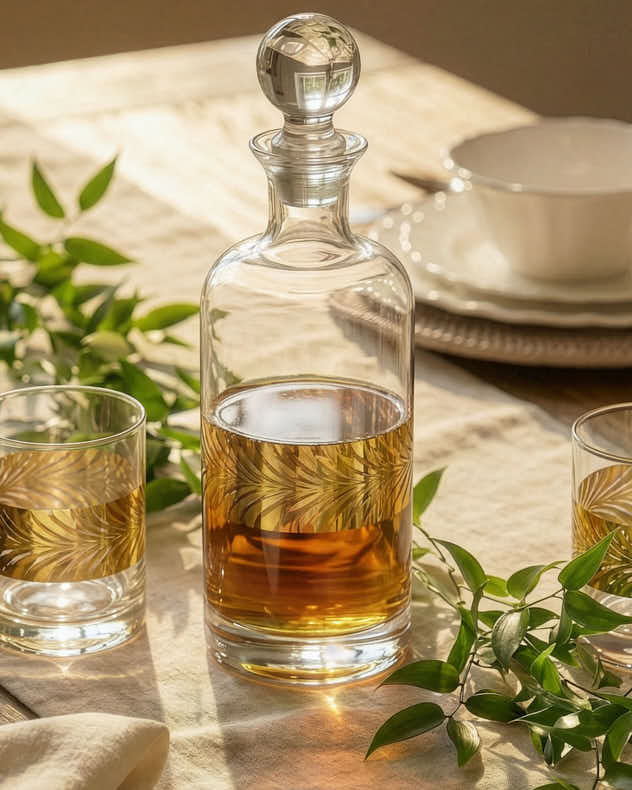 This collection includes glass decanters for wine and spirits, alongside drinks buckets, bottle holders and bar tool sets designed to support both casual gatherings and more deliberate occasions. Cut glass and embossed details introduce interest, while metal finishes add weight and presence, allowing each piece to feel reassuring in the hand.