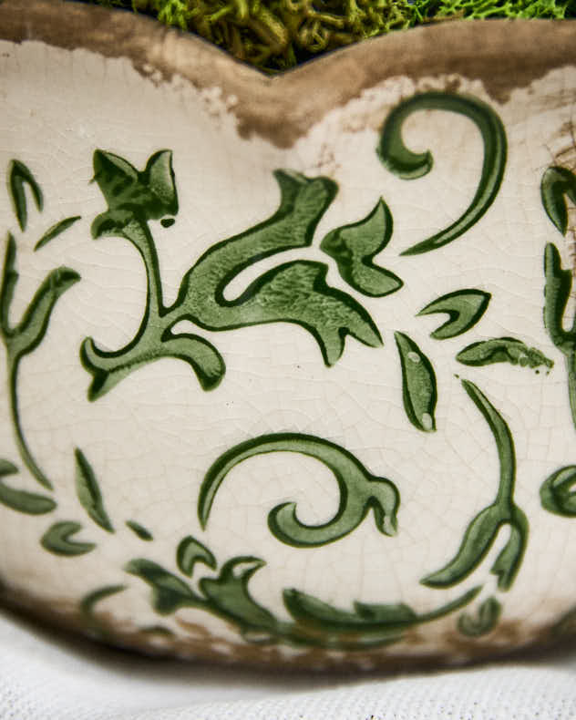 Each plant pot boasts scalloped detail around the rim, and is painted with a pattern of botanical green leaves that provide a beautiful contrasting effect against the natural background.