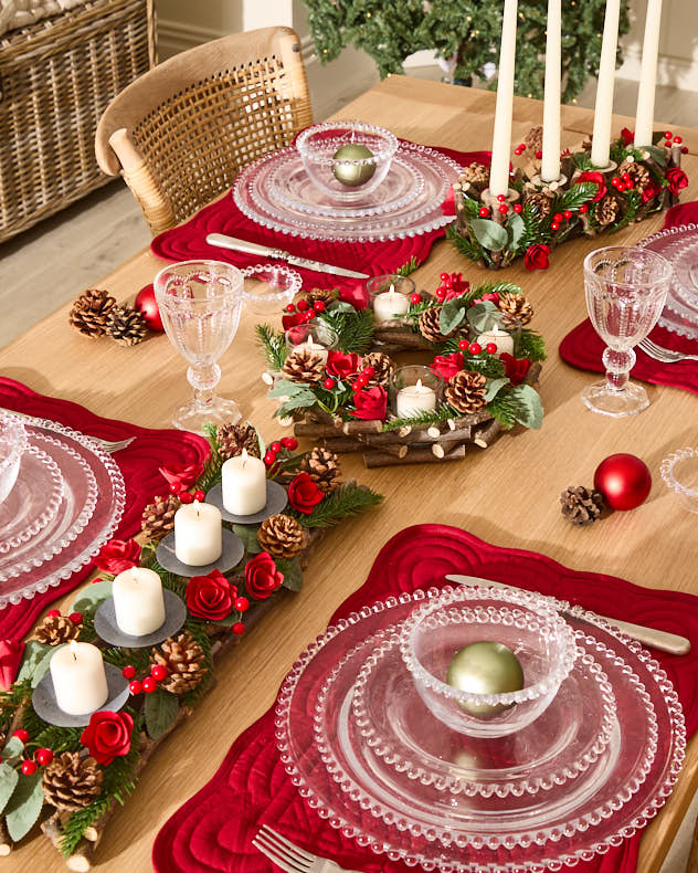 Interwoven forest branches and pinecones, sprigs of evergreen leaves and delicate rose decorations are just the thing to add a touch of luxury to your dining room this Christmas.