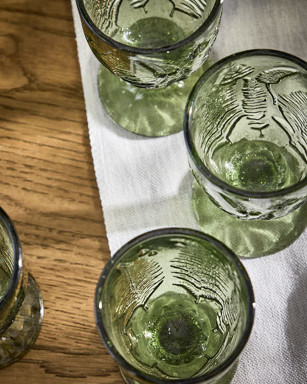 Decorated with an embossed fern leaf design and finished in natural green shade, this coloured wine goblet will be a welcome addition to your glassware collection.