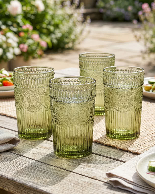 This collection includes wine goblets, champagne flutes, tumblers and decanters in a wide range of embossed and coloured designs. Subtle botanical motifs, ribbed detailing and classic pressed patterns create visual interest without overwhelming the table. Coloured glassware, from soft rose and amber tones to deeper greens and blues, allows pieces to be mixed and matched with ease.