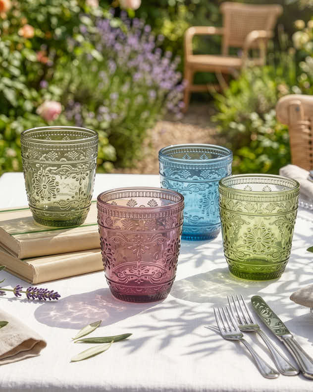 This collection includes wine goblets, champagne flutes, tumblers and decanters in a wide range of embossed and coloured designs. Subtle botanical motifs, ribbed detailing and classic pressed patterns create visual interest without overwhelming the table. Coloured glassware, from soft rose and amber tones to deeper greens and blues, allows pieces to be mixed and matched with ease.