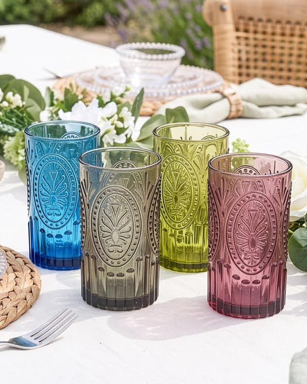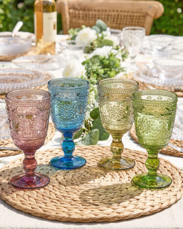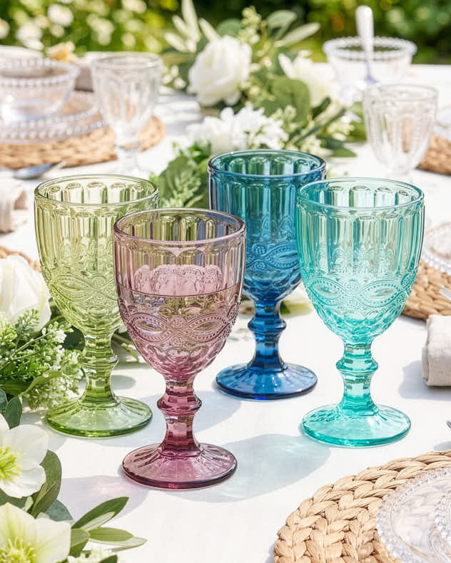 This collection includes wine goblets, champagne flutes, tumblers and decanters in a wide range of embossed and coloured designs. Subtle botanical motifs, ribbed detailing and classic pressed patterns create visual interest without overwhelming the table. Coloured glassware, from soft rose and amber tones to deeper greens and blues, allows pieces to be mixed and matched with ease.