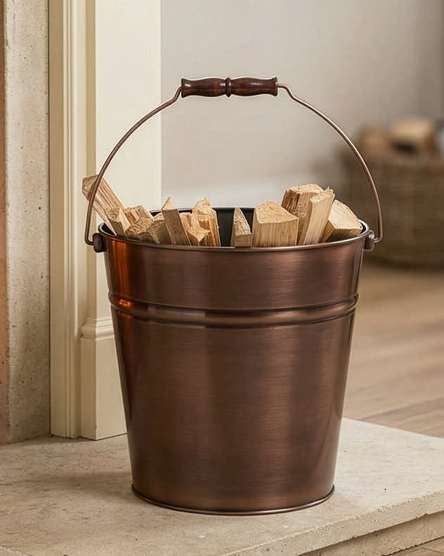 Pairing your storage of kindling with a bucket for logs gives you a complete and structured system. Our antique coal bucket for logs is a practical option. It provides the easiest way to store larger pieces of firewood.