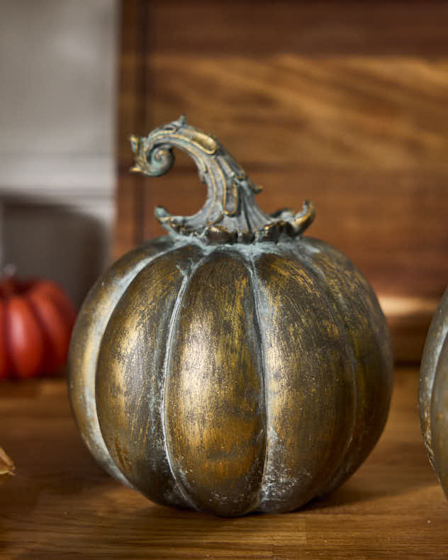 Each pumpkin is made from durable polyresin in a burnished brass colour for a more luxurious alternative to the traditional orange. This paired with the intentionally time-worn patina finish and textured attention to detail gives the Halloween decorations an antique inspired look.