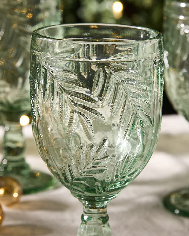 This matching pair of wine glasses boast a hand-pressed embossed leaf design and a soft sage green colour that's sure to add a touch of subtle botanical inspired character to your celebrations and be the envy of your guests.
