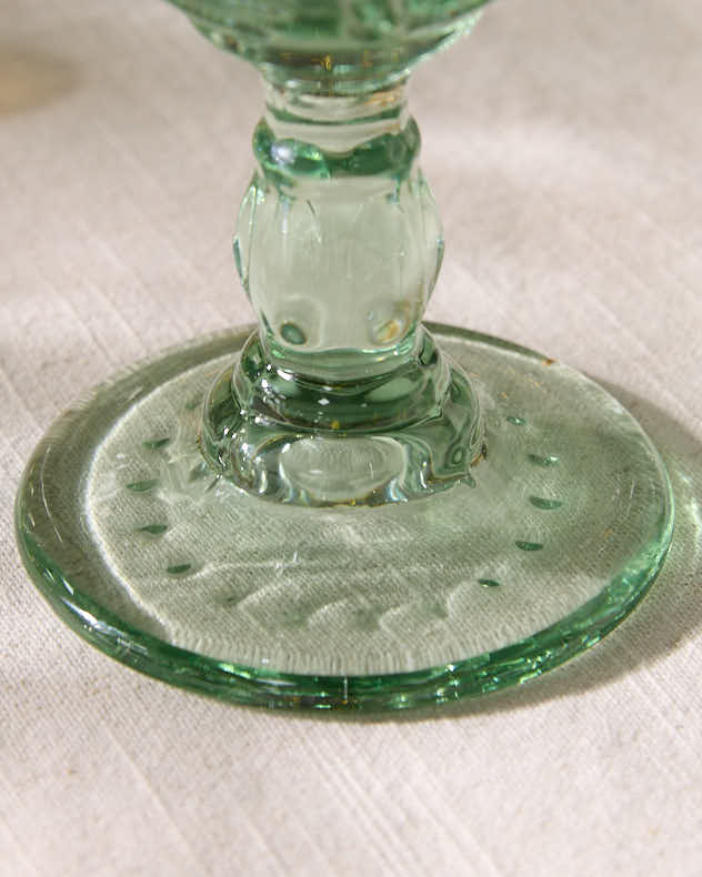 Each footed glass features a delicate pattern of leaves, and the colour will catch the light beautifully to stand significant among any tableware, or displayed in pride of place in a glassware cabinet perhaps.