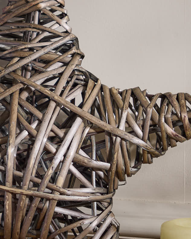 Unsere hängende Sterndekoration hat einen leichten Metallrahmen, um den liebevoll natürliches Weidengeflecht geflochten ist. Mit ungefärbter, heller Waschung für ein rustikales Wohnaccessoire.