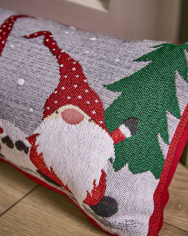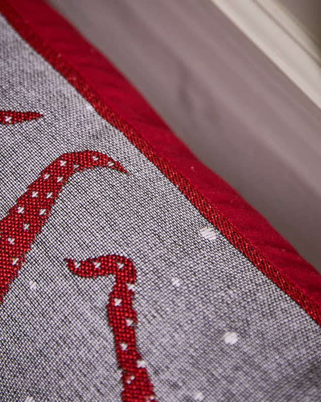 Der lange Zugluftstopper ist aus einem Baumwollmischgewebe in nordischem Grau gefertigt und mit einer markanten roten Paspelierung an den Kanten versehen, die ihm einen schönen letzten Schliff verleiht. Eine Gruppe freundlicher, festlicher Gnome ziert die Vorderseite, und Details eines Weihnachtsbaums runden das skandinavisch inspirierte Motiv perfekt ab.