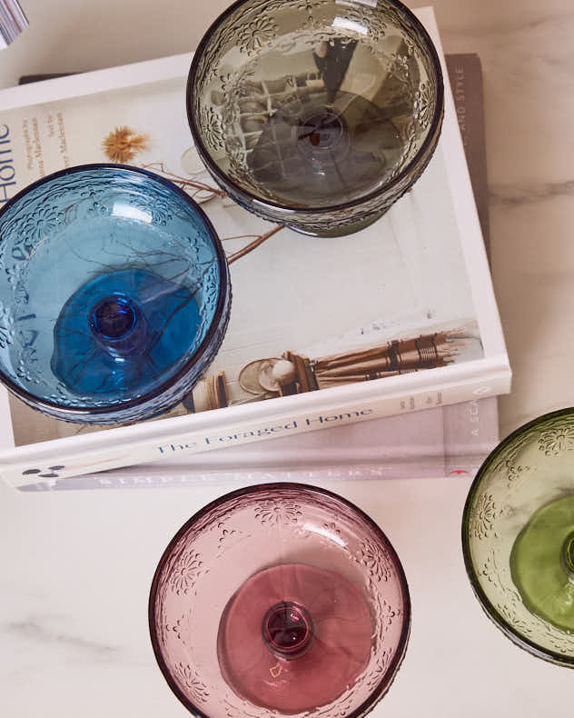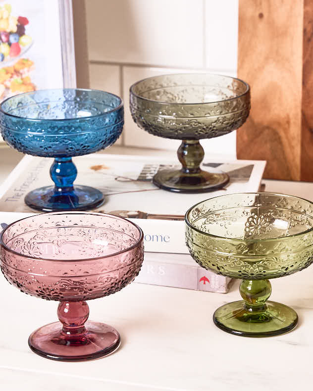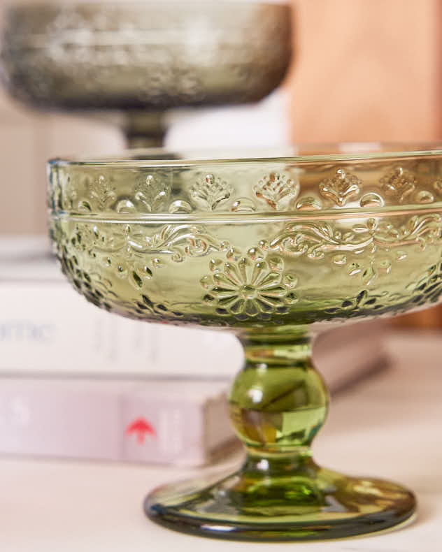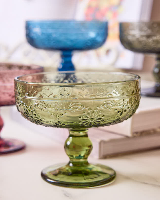 Unsere opulenten Schalen mit Fuß sind in vier leuchtenden Juwelenfarben erhältlich, die das Licht wunderschön einfangen, und sind mit einem handgepressten, geprägten Blumenmuster verziert, das jedem Anlass einen Hauch von Luxus verleiht.