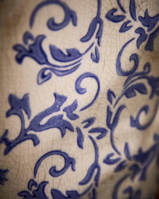 Die satte Cremefarbe hebt das leuchtend blaue Blumenmuster wunderschön hervor und erzeugt einen atemberaubenden visuellen Kontrast.