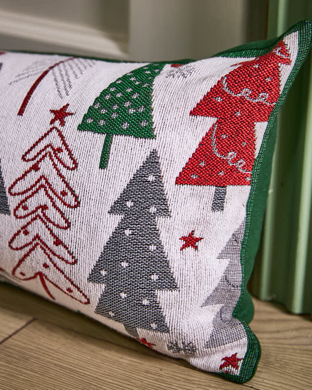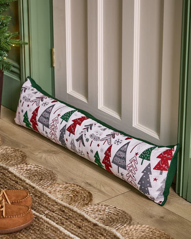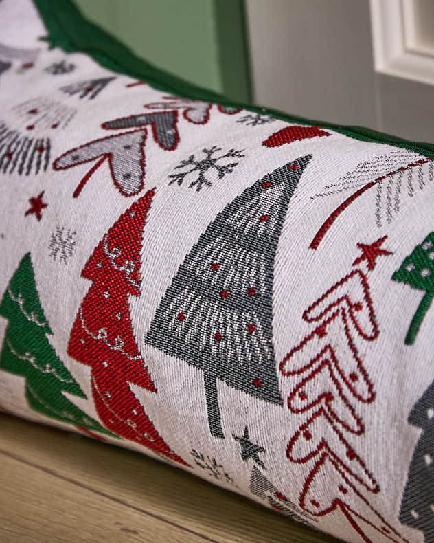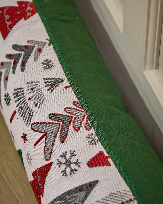 Der lange Zugluftstopper ist aus einem schneeweißen Baumwollmischgewebe gefertigt und mit einer smaragdgrünen Paspelierung an den Kanten versehen, die ihm einen eleganten Abschluss verleiht. Ein Wald aus modernen Weihnachtsbäumen und Schneeflocken in klassischen Rot-, Grün- und nordischen Grautönen ziert die Vorderseite und hebt sich deutlich vom neutralen Hintergrund ab.