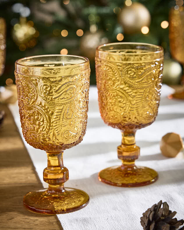 With its detailed embossed paisley pattern and golden yellow colour, this wine goblet will be a striking addition to your glassware collection. Made from high-quality hand-blown tinted glass, this vibrant goblet will reflect the light beautifully, creating a warming atmosphere.