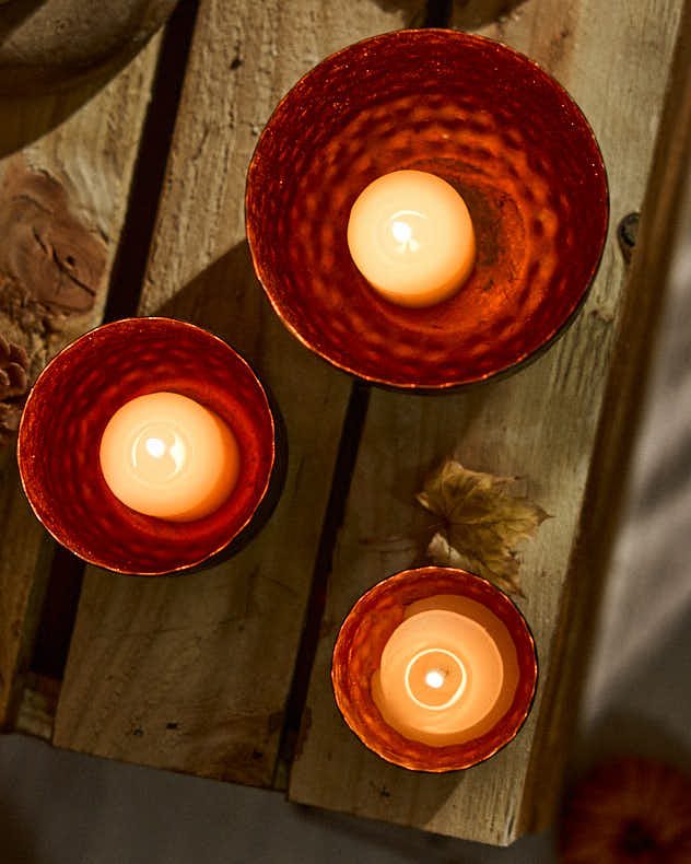 This trio of contemporary tealight holders are finished with a hand-hammered iron exterior and reflective copper interior to give off a warm and cosy glow. With the varying sizes, you can arrange them together for an eye-catching design, or dot them around your home.