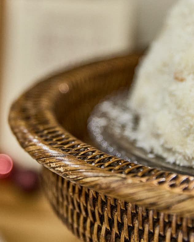Made from woven rattan with a glazed brown finish and standing on a sturdy footed base with a bar patterned design, this large display stand is ideal for an array of uses, whether used as a fruit bowl on the kitchen worktop or a cake stand for serving fresh home baked goods at the dinner table.