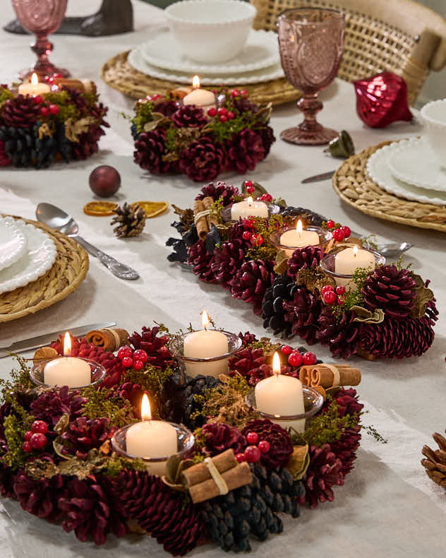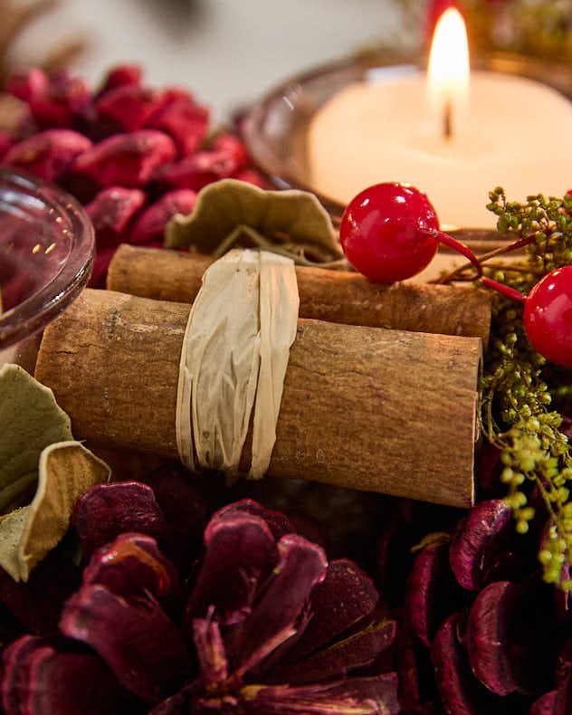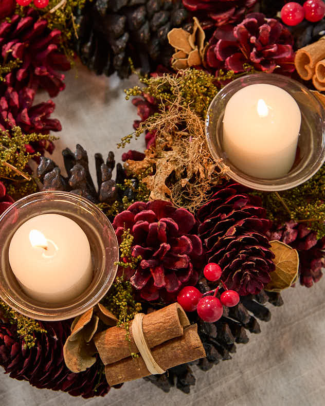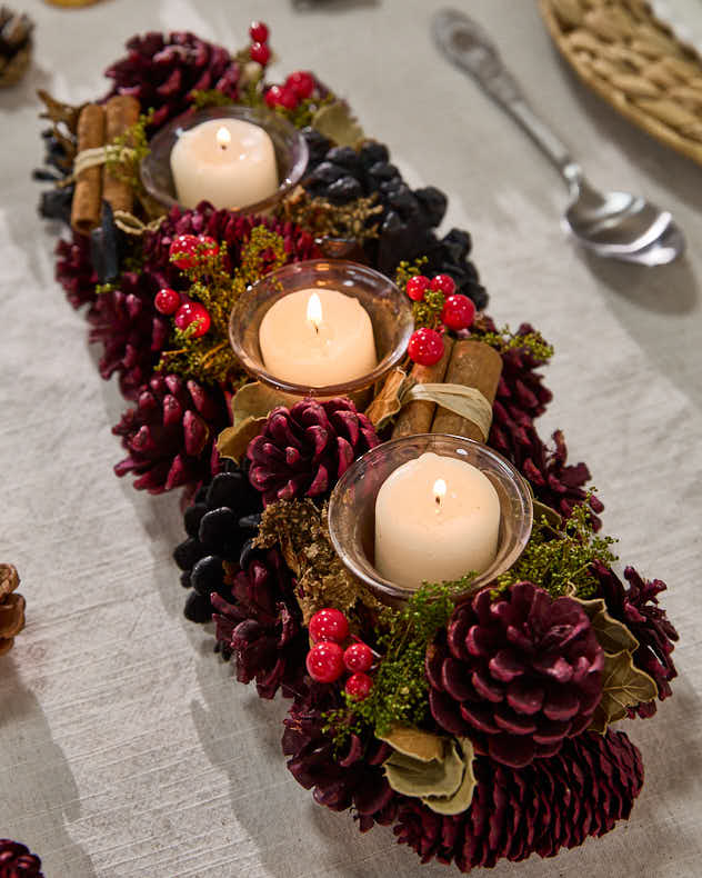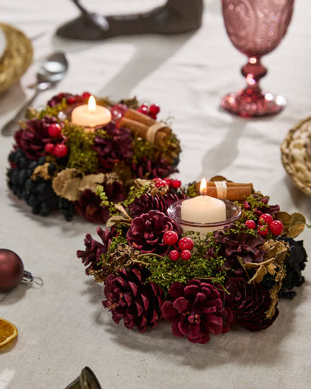 Sûrs de vous rappeler les chaleureux Noëls passés et de vous remplir de nostalgie, nos bougeoirs sont décorés de vraies pommes de pin dans des tons verts foncés et rouges, de baies rouges charnues, de mousse et de bâtons de cannelle parfumés.