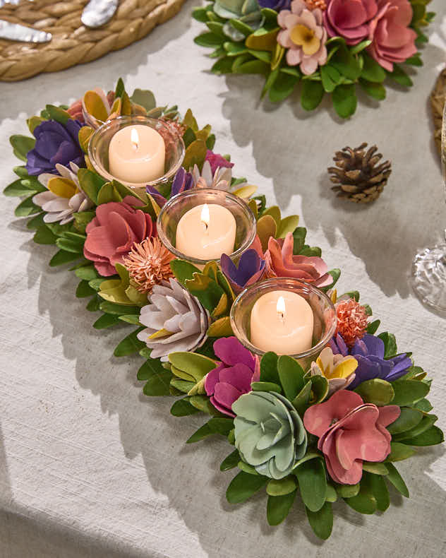 Fabriqué à partir de fleurs de crocus en bois vert sauge et agrémenté de roses en bois multicolores et de chardons, ce triple porte-bougies chauffe-plat est l'accessoire parfait pour décorer un rebord de fenêtre, une cheminée ou une table à manger, et illuminer votre repas de la douce lueur d'une bougie chauffe-plat ou d'une bougie votive.