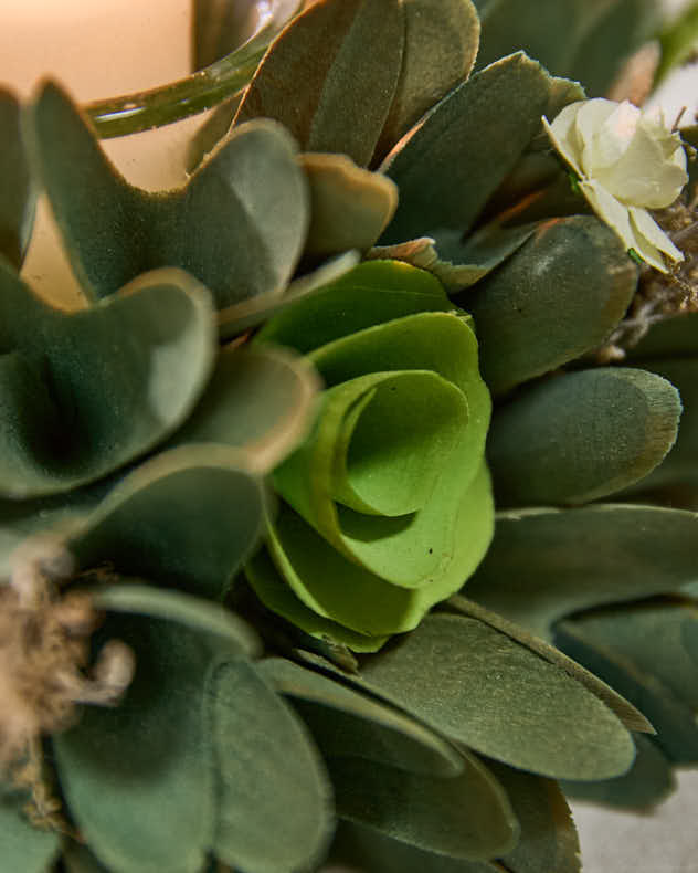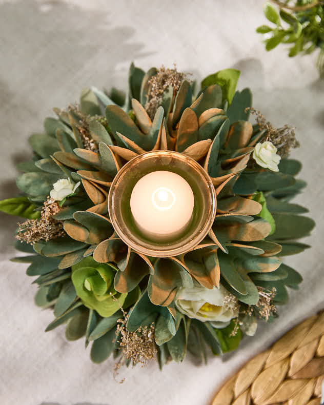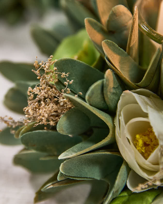 Fabriqués à partir de fleurs de crocus en bois vert sauge et agrémentés de fausses roses blanches et de brins de bruyère, ces deux photophores constituent l'accessoire parfait pour décorer un rebord de fenêtre, une cheminée ou une table à manger, et illuminer votre repas de la douce lueur d'une bougie chauffe-plat ou d'une bougie votive.