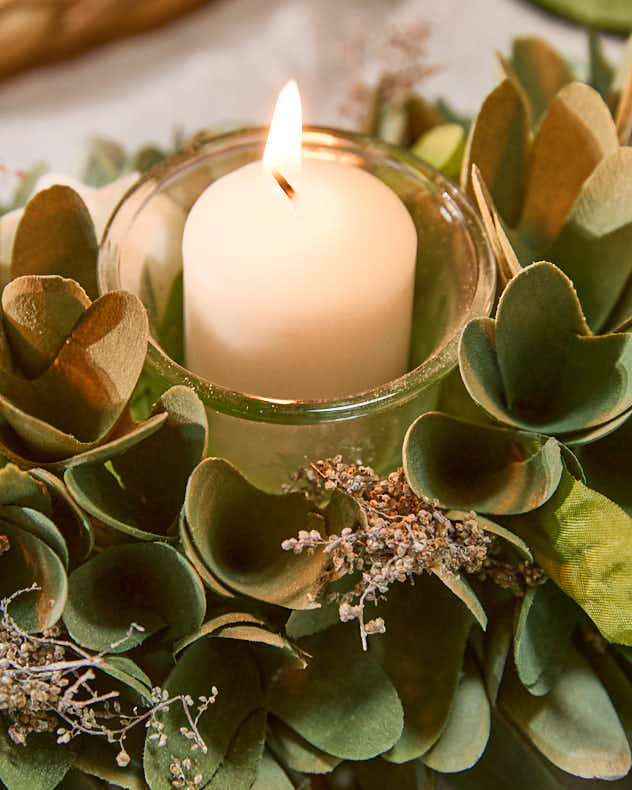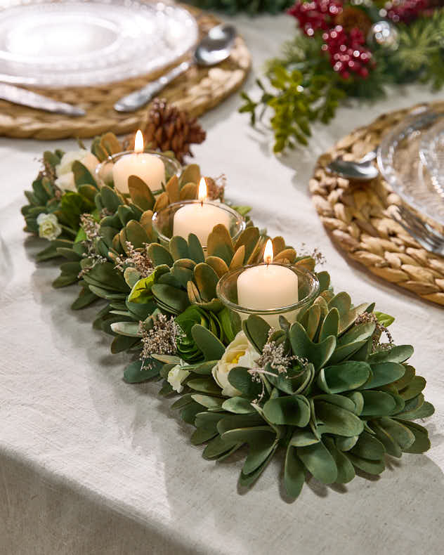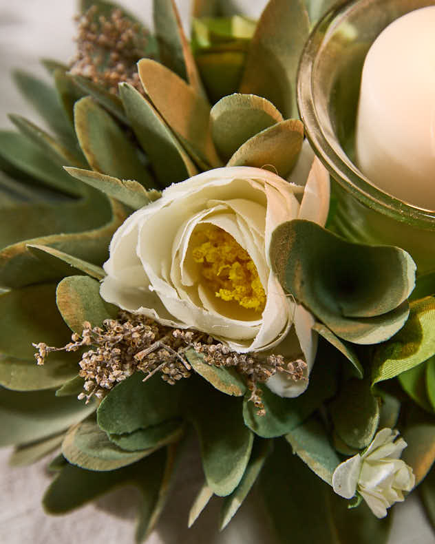 Fabriqué à partir de fleurs de crocus en bois vert sauge et agrémenté de décorations de roses blanches artificielles et de brins de bruyère, ce triple porte-bougies chauffe-plat est l'accessoire parfait pour décorer un rebord de fenêtre, une cheminée ou une table à manger, et illuminer votre repas de la douce lueur d'une bougie chauffe-plat ou d'une bougie votive.