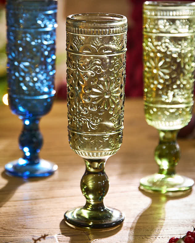 Including four jewel-bright colours that will catch the light beautifully, our opulent Champagne glasses are decorated with a hand-pressed embossed floral design that will bring a touch of luxury to any occasion.