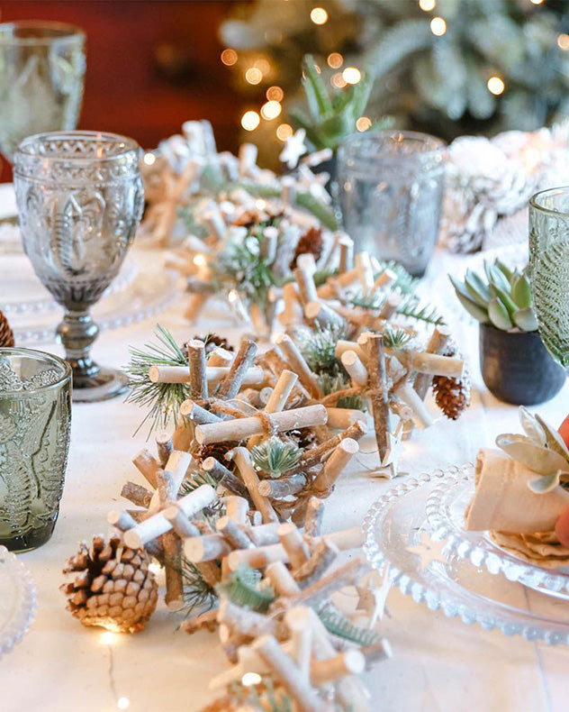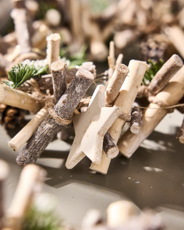 Avec ses bûches entrecroisées et ses étoiles filantes en bois, notre guirlande givrée apporte une touche rustique et charmante à votre décoration hivernale. Assemblée avec de la ficelle et délicatement saupoudrée de neige scintillante, cette décoration de Noël dégage un charme authentique et artisanal.