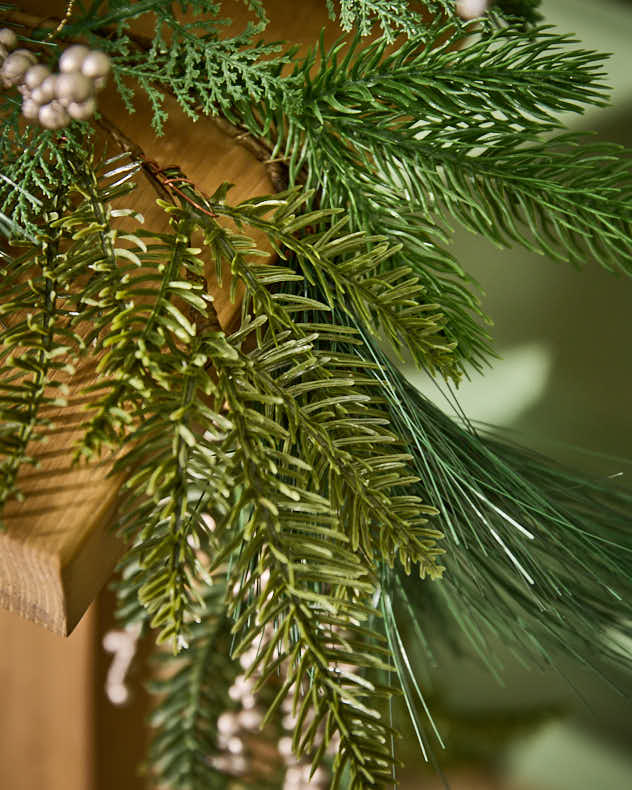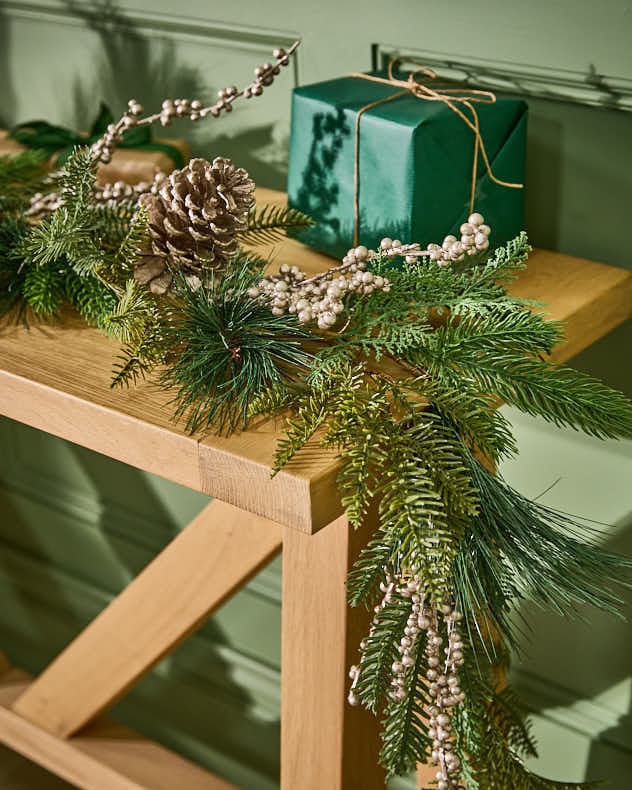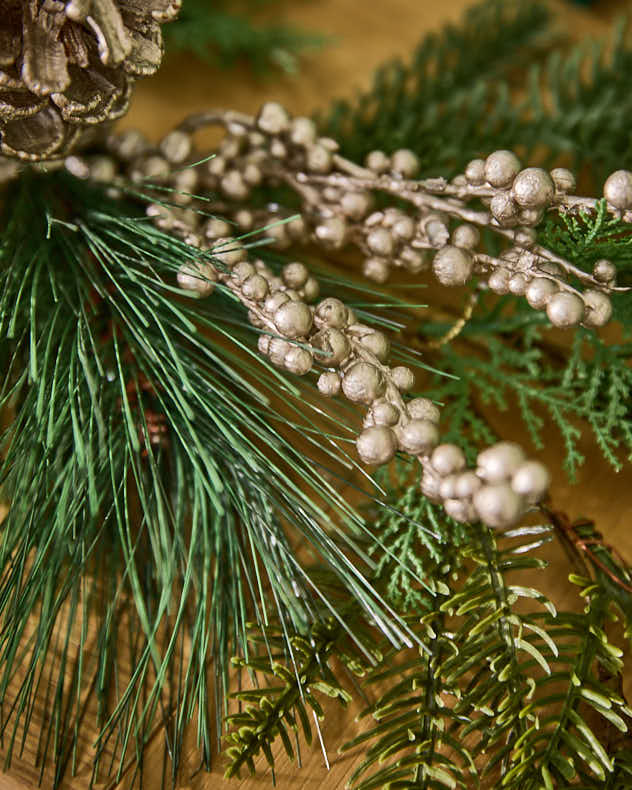 Des boules dorées se dissimulent sous les arbustes artificiels, apportant une touche finale scintillante à votre décoration de saison. Suspendez cette guirlande au-dessus d'une cheminée crépitante ou enroulez-la autour de votre rampe d'escalier.