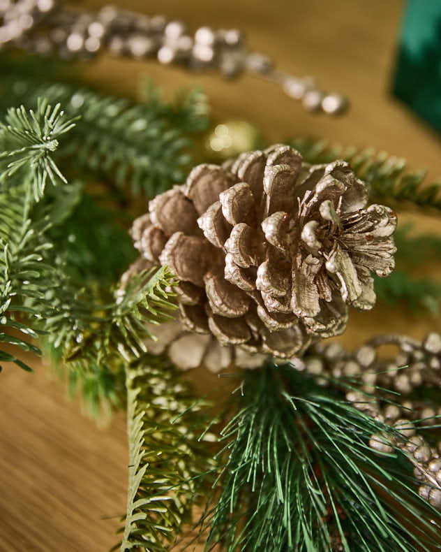 Avec ses fausses feuilles de sapin qui lui confèrent son allure hivernale emblématique, cette guirlande sublimera n'importe quelle maison grâce à son luxueux design artisanal. Le gui artificiel couleur champagne ajoute à la magie de Noël de cette décoration, sublimée par les pommes de pin assorties.