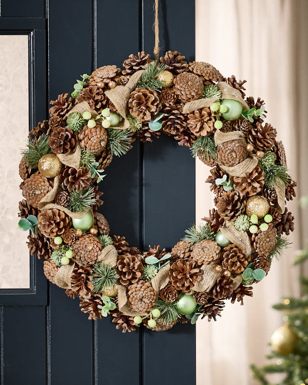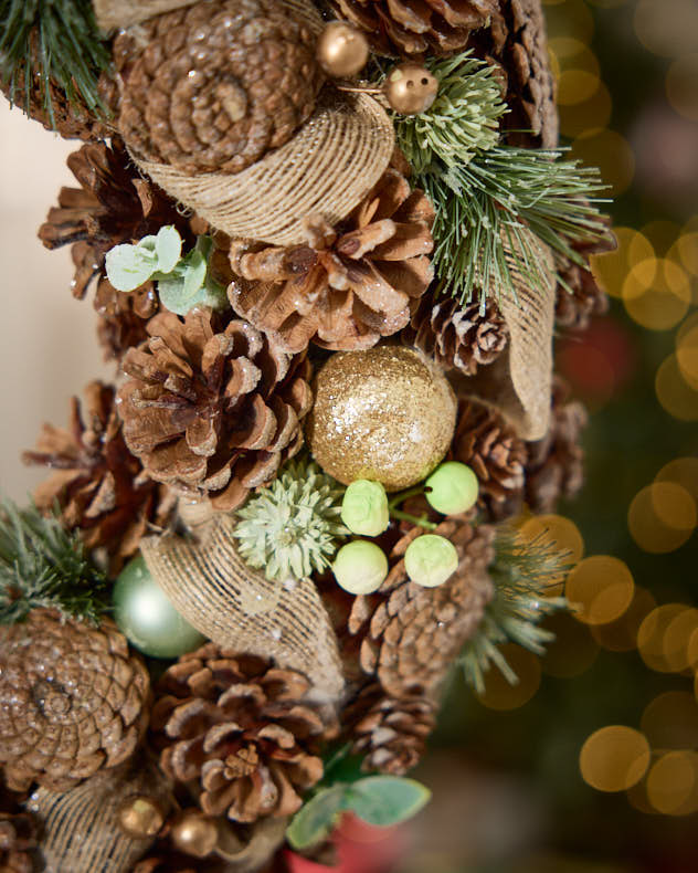 Débordante de textures naturelles grâce à ses pommes de pin et à ses feuilles d'eucalyptus, notre couronne apporte le charme des forêts hivernales directement à votre porte d'entrée.