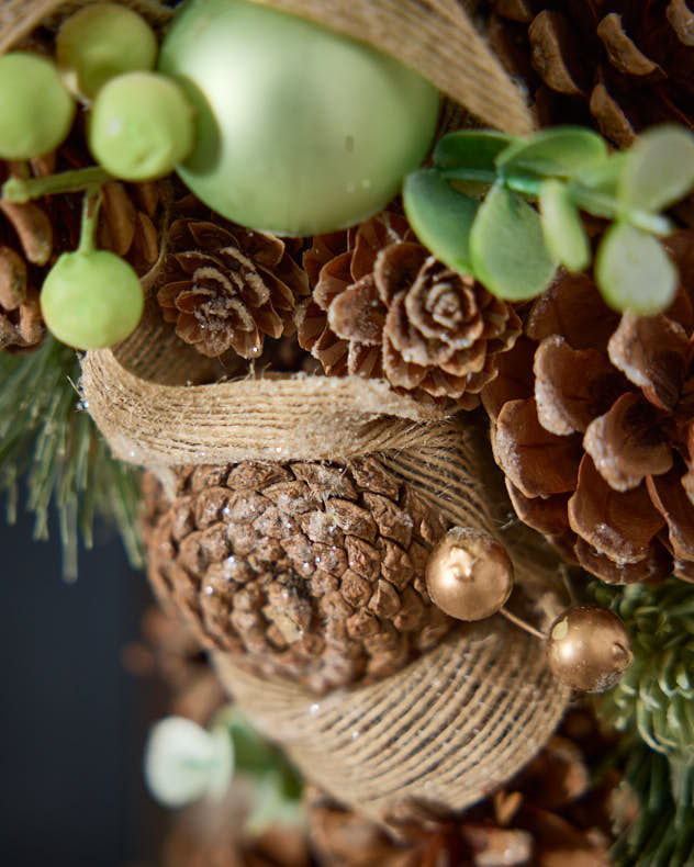 Entre les feuillages et les baies blanches d'hiver, des rubans de tweed soigneusement tissés apportent une touche artisanale. Les boules nacrées dorées et vertes incarnent à merveille la magie et la nouveauté de Noël.